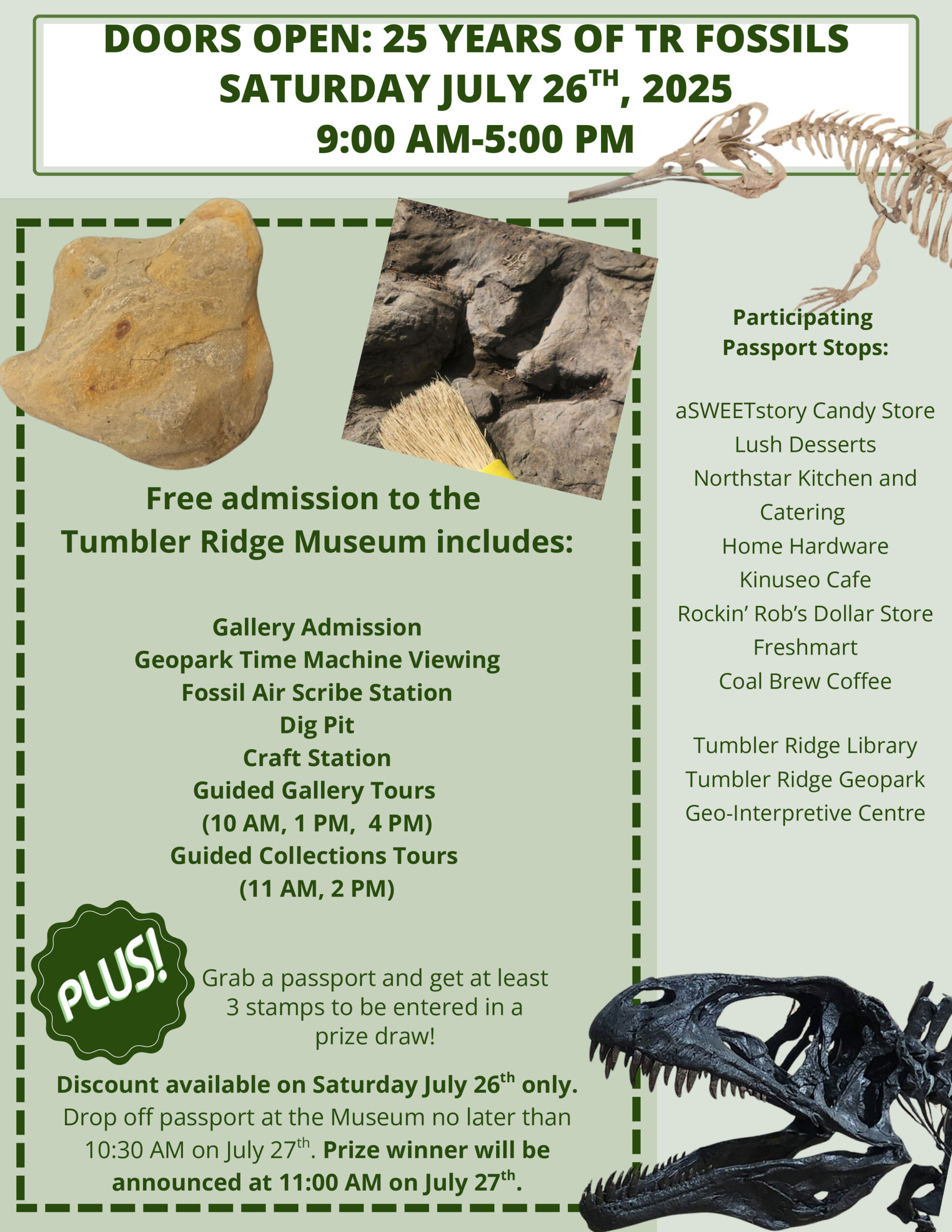 Free gallery admission, Geopark Time Machine Viewing, Fossil Air Scribe Station, Dig Pit, Craft Station, Guided Gallery Tours, Guided Collection Tours, Tumbler Ridge Passport Contest